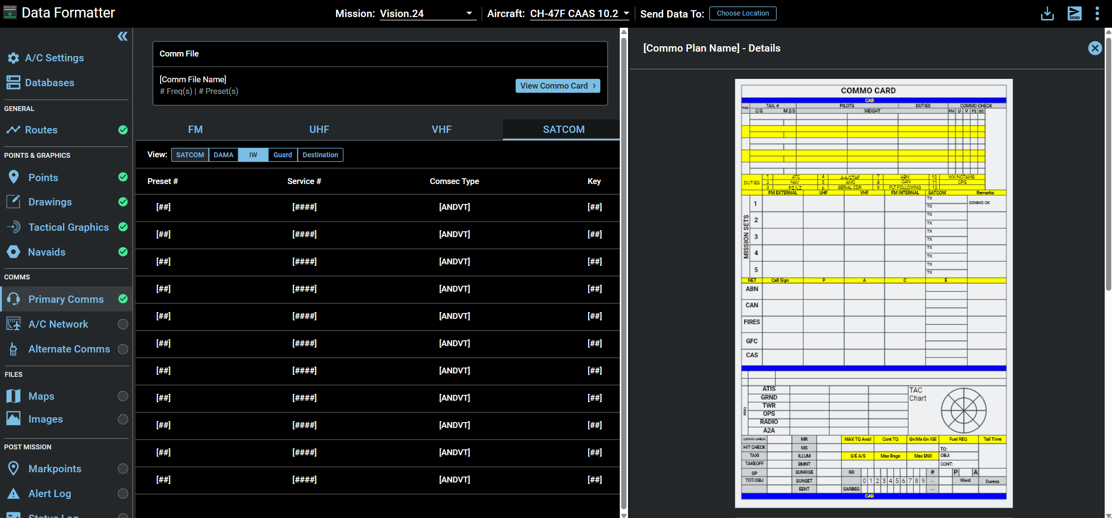 In other categories, like comms, the UI is tailored to its specific needs. In this case a single plan is imported contains many types of comms data so the main file is identified in the body header with its information below organized by radio types. Feature improvements like generating a commo card (knee card) of the imported comms data that pilots frequently reference during a mission were also incorporated.
