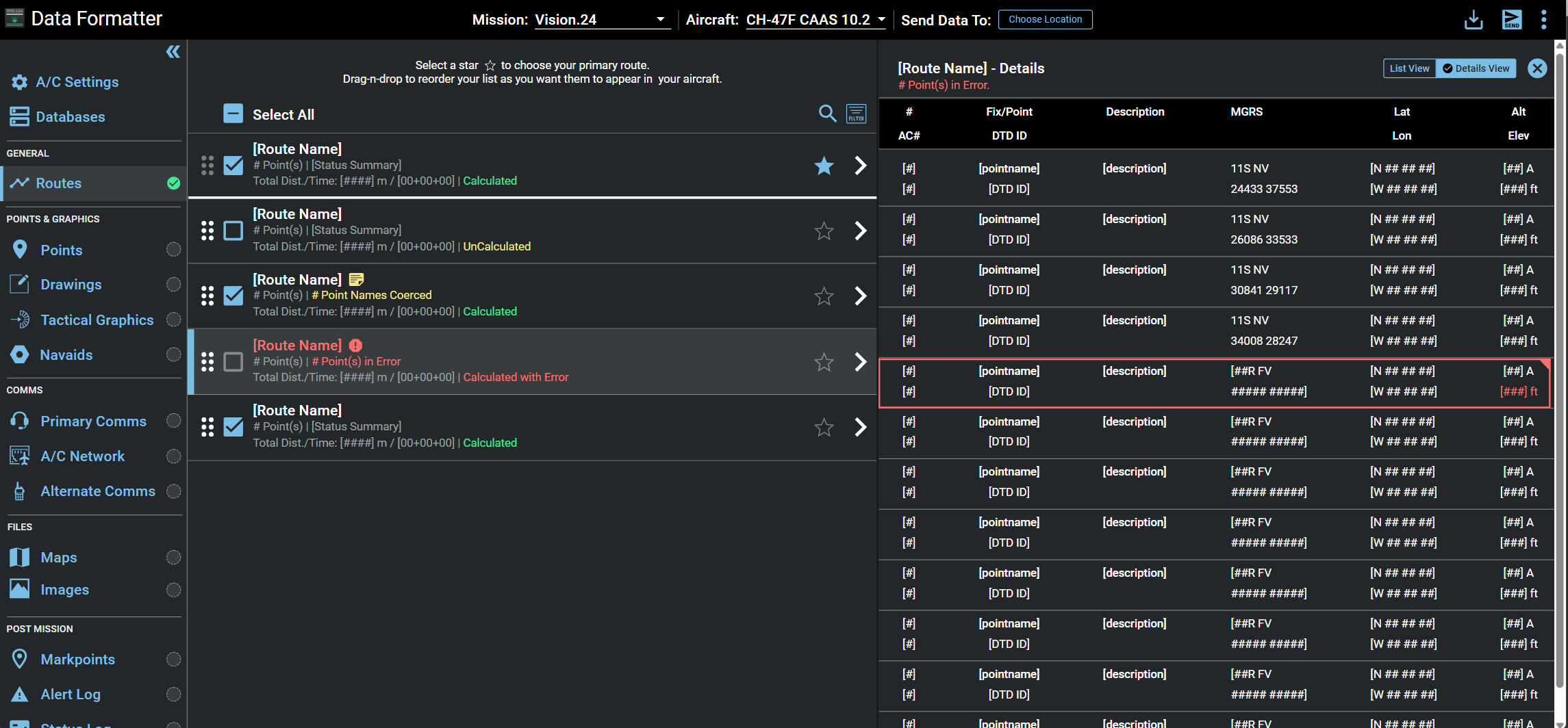 Imported routes are available for mission selection in the main body panel. General information about the route is readily available within the item’s sub-text. Highlighting a route displays a details view of its route point information at the right. If validation errors do occur that prohibit aircraft acceptance they are clearly marked through disabled selection checkboxes and error styling.